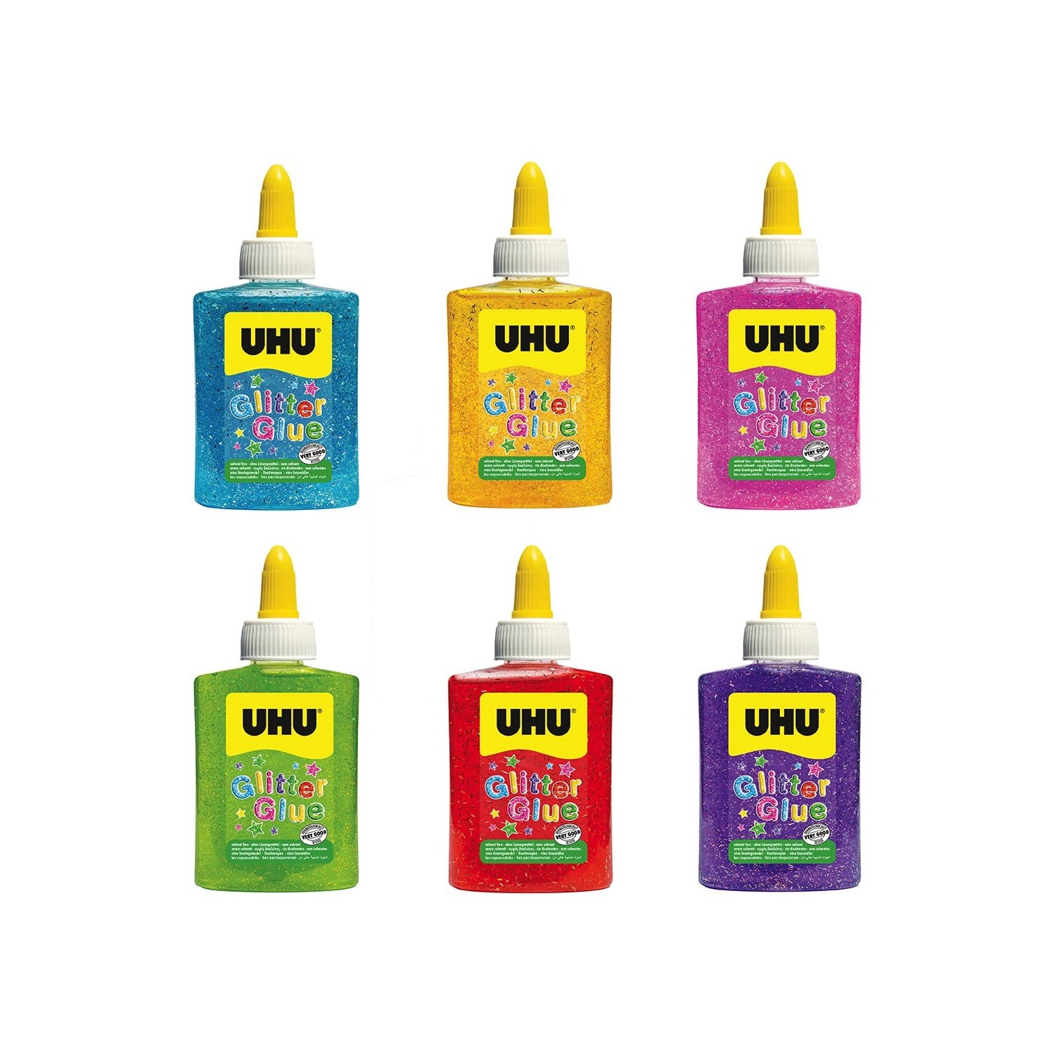 Oltre all'azzurro, UHU Glitter Glue è disponibile in altre cinque vivaci colorazioni: blu, giallo, rosa, rosso, verde e viola. Libera la tua immaginazione scegliendo il colore che più ti piace!