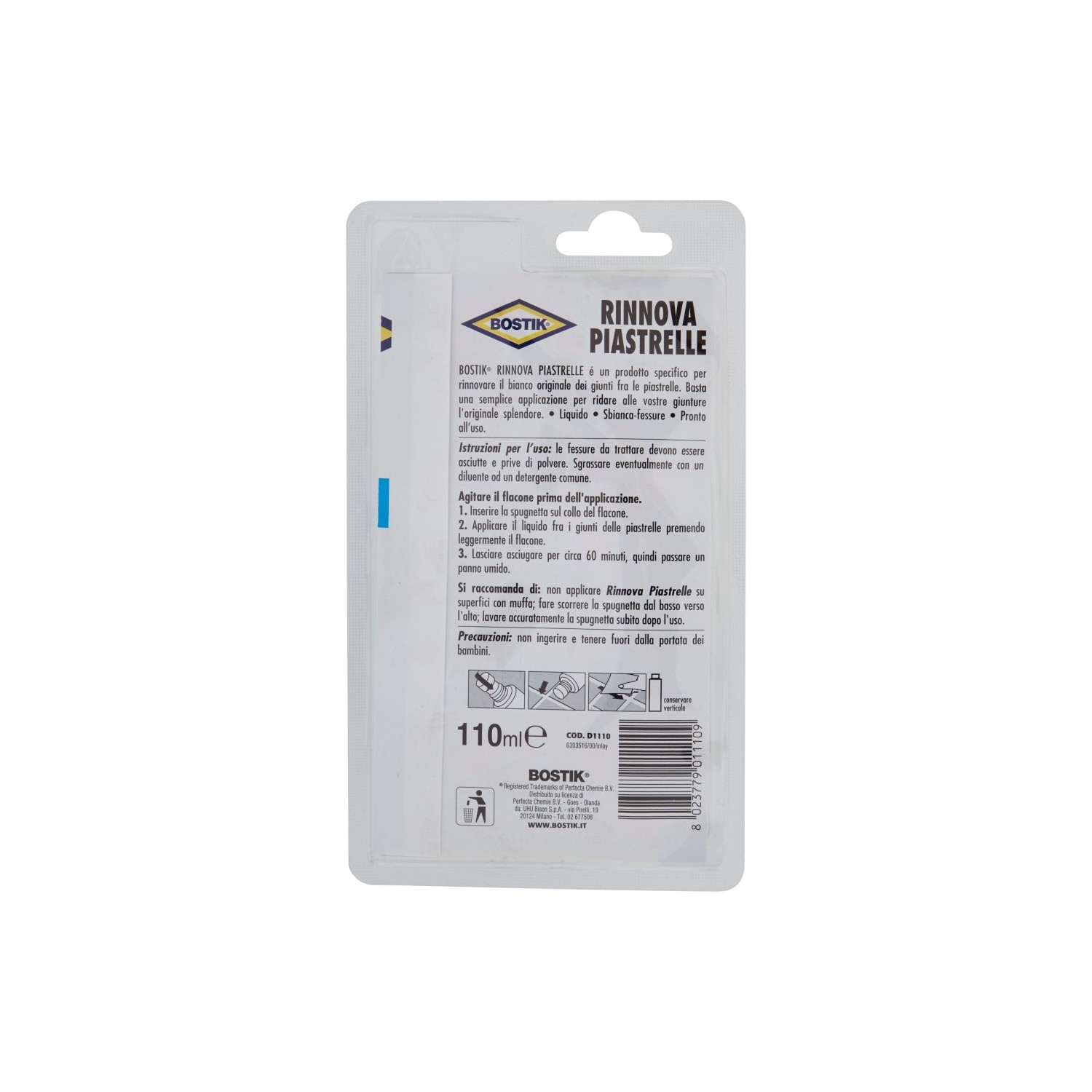 Punti di attenzione: Dopo avere applicato Bostik Rinnova Piastrelle, fare asciugare le fughe per almeno 4 ore. Si consiglia di non applicare Bostik Rinnova Piastrelle alle fughe soggette a muffa. Non ingerire e tenere fuori dalla portata dei bambini.