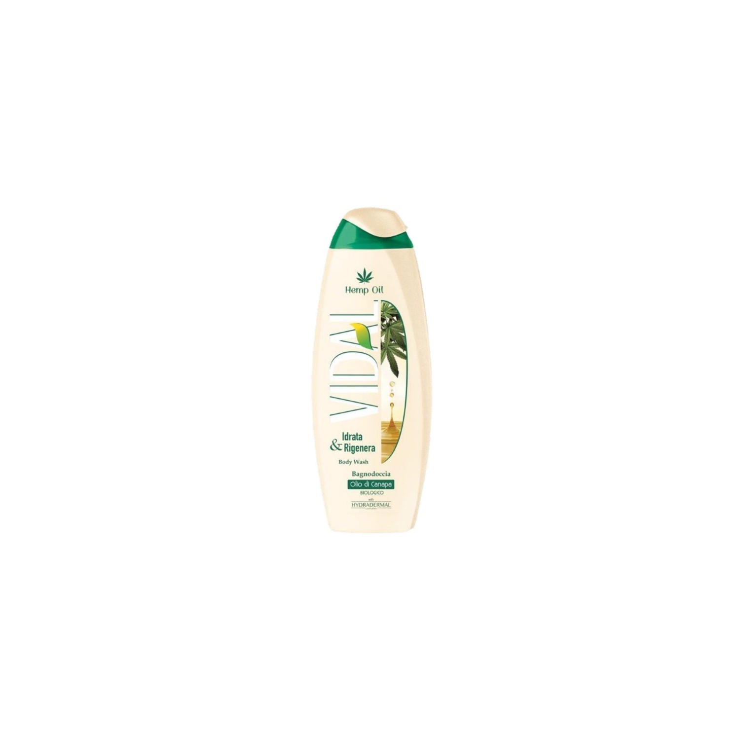 Bagnodoccia Vidal arricchito con olio di canapa, ricco di acidi grassi essenziali e vitamina E.