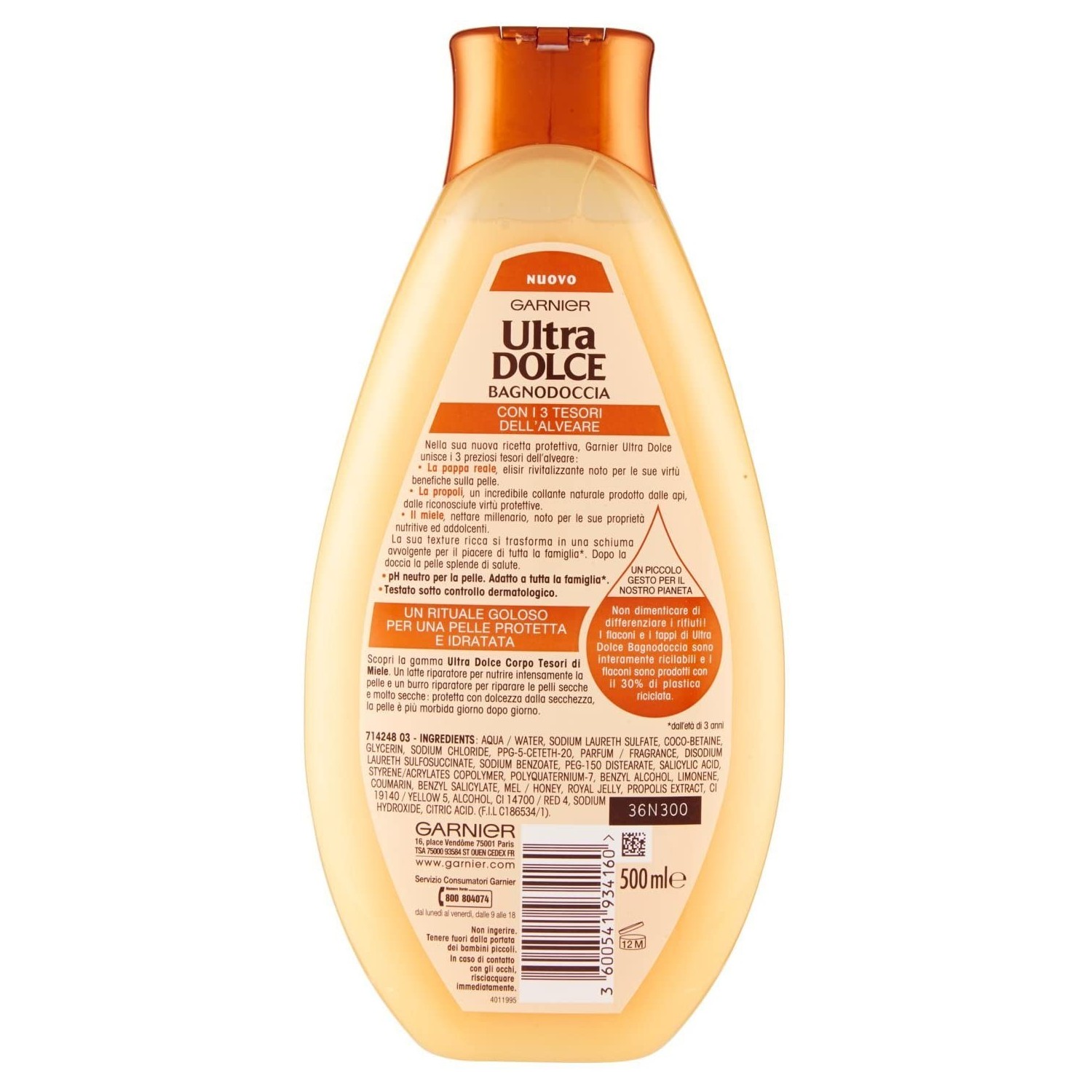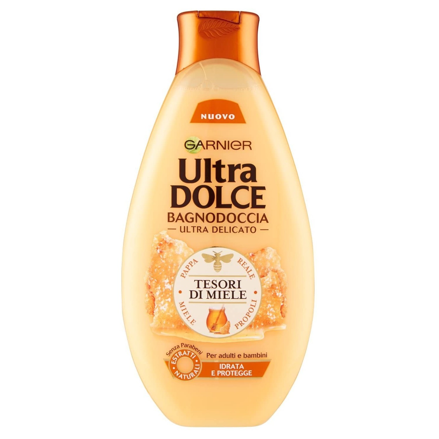 Nella sua nuova ricetta protettiva, Garnier Ultra Dolce unisce i 3 preziosi tesori dell'alveare: La pappa reale, elisir rivitalizzante noto per le sue virtù benefiche sulla pelle, La propoli, un incredibile collante naturale prodotto dalle api, dalle riconosciute virtù protettive e Il miele, nettare millenario, noto per le sue proprietà nutritive ed addolcenti. La sua texture ricca si trasforma in una schiuma avvolgente per il piacere di tutta la famigli.