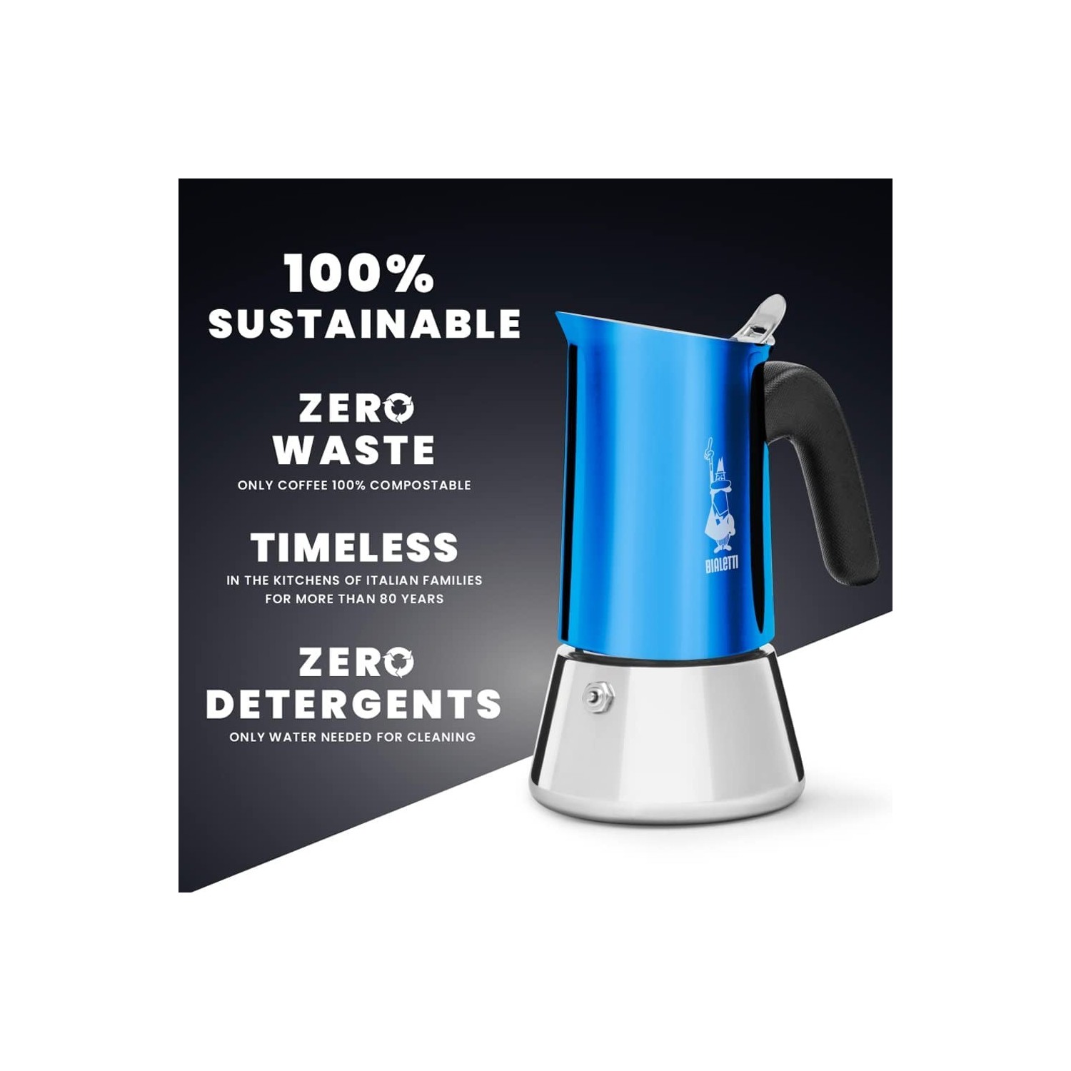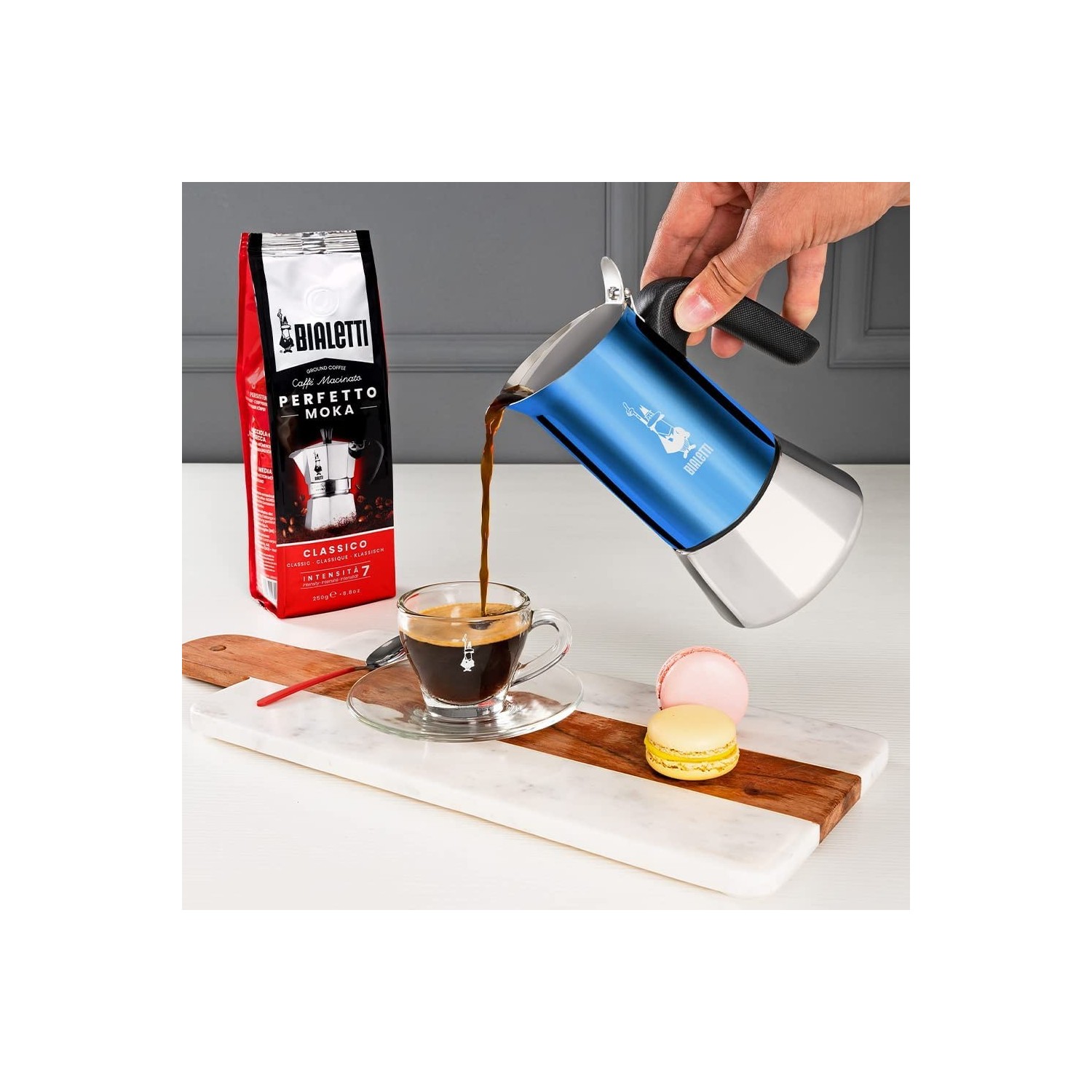 Capacità per 2 tazze (85 ml), non adatta all'induzione. La sua tonalità di colore blu la rende perfetta per arredare la tua cucina con stile.