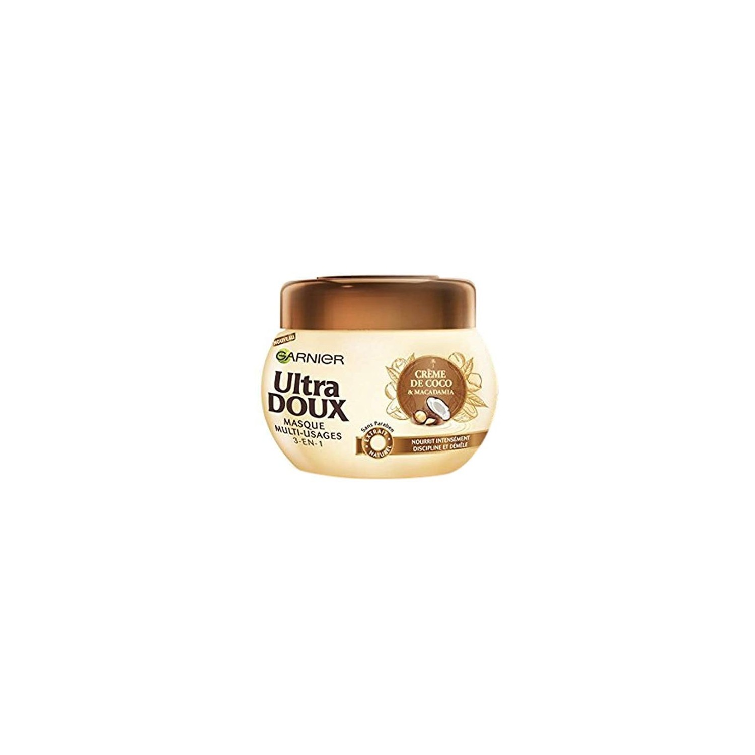 Garnier Ultra Dolce crea la sua ricetta di cura multiuso per nutrire intensamente i capelli da normali a secchi senza appesantirli. Combina la crema di cocco, generosa miscela di olio di cocco e latte di cocco, famosa per nutrire intensamente i capelli e la macadamia, con eccezionali virtù nutritive. La maschera può essere applicata in 3 modi: 1- In maschera da sciacquare per nutrire i capelli. 2- Su capelli bagnati, in cura senza risciacquo per districare e facilitare lo styling. 3- Su capelli secchi, ritocco senza risciacquo per lisciare e disciplinare i capelli dolcemente.