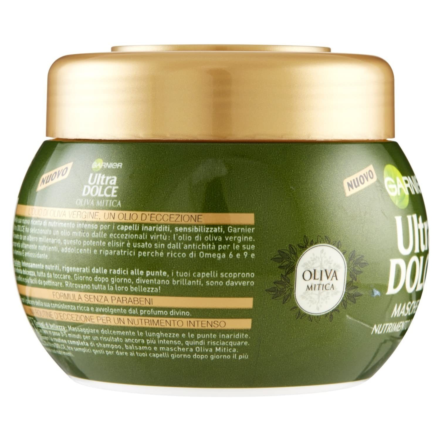 Nella sua nuova ricetta di nutrimento intenso per i capelli inariditi, sensibilizzati, Garnier Ultra Dolce ha selezionato un olio mitico dalle eccezionali virtù: l'olio di oliva vergine. Ricavato da un albero millenario, questo potente elisir è usato sin dall'antichita per le sue proprietà altamente nutrienti, addolcenti e riparatrici perché ricco di Omega 6 e 9 e di vitamina E antiossidante. Risultato: Intensamente nutriti, rigenerati dalle radici alle punte, i tuoi capelli scoprono un'infinita dolcezza, tutta da toccare. Giorno dopo giorno, diventano brillanti, sono davvero più soffici e più facili da pettinare. Ritrovano tutta la loro bellezza! Formula senza parabeni Scopri il piacere della sua consistenza ricca e avvolgente dal profumo divino. Una routine d'eccezione per un nutrimento intenso