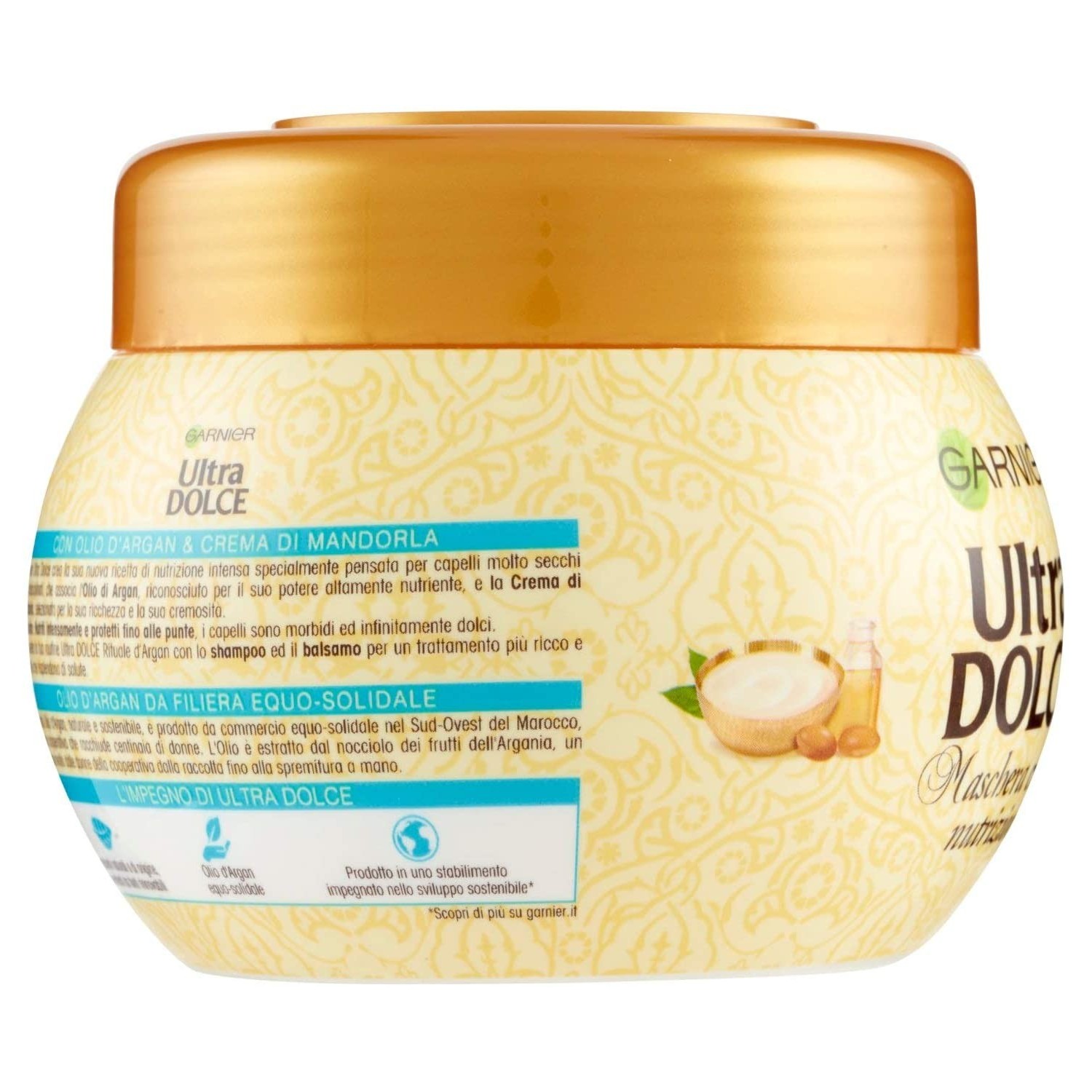 Garnier Ultra Dolce crea la sua nuova ricetta di nutrizione intensa specialmente pensata per capelli molto secchi ed indisciplinati, che associa l'Olio di Argan, riconosciuto per il suo potere altamente nutriente, e la Crema di Mandorla, selezionata per la sua ricchezza e la sua cremosità. Nutriti intensamente e protetti fino alle punte, i capelli sono morbidi ed infinitamente dolci.
