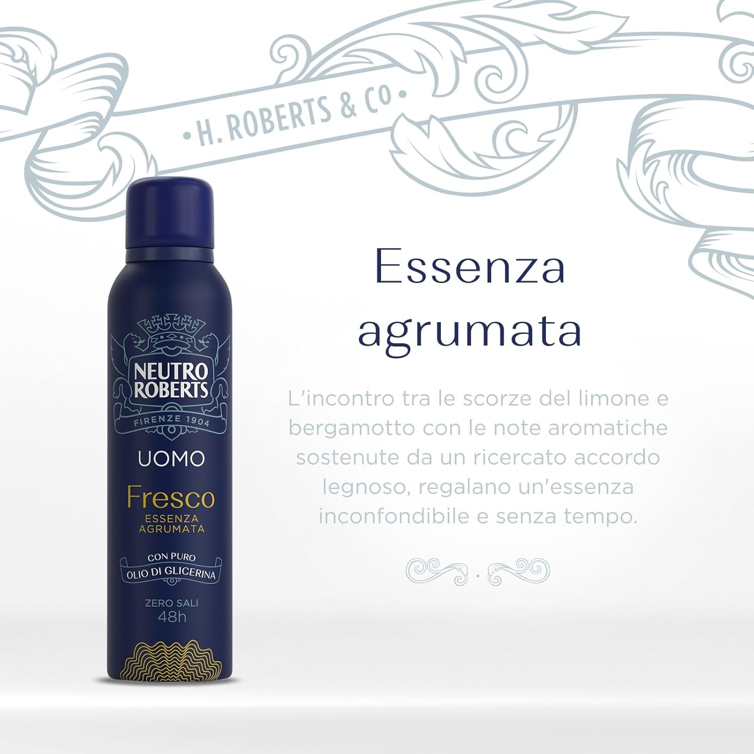 Scopri il Neutro Roberts Fresco Verde, un deodorante spray con una essenza agrumata fresca e vibrante, studiato per offrire protezione efficace fino a 48 ore