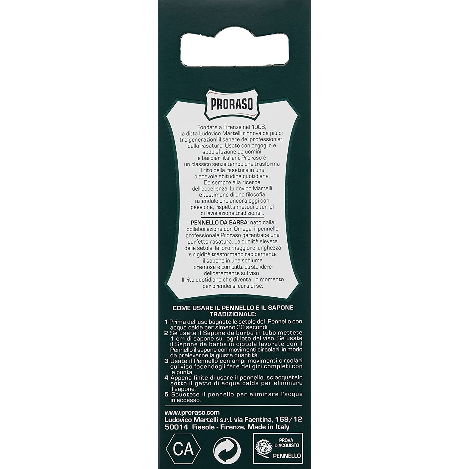 Informazioni sul retro della confezione del Proraso Pennello da Barba Professionale.