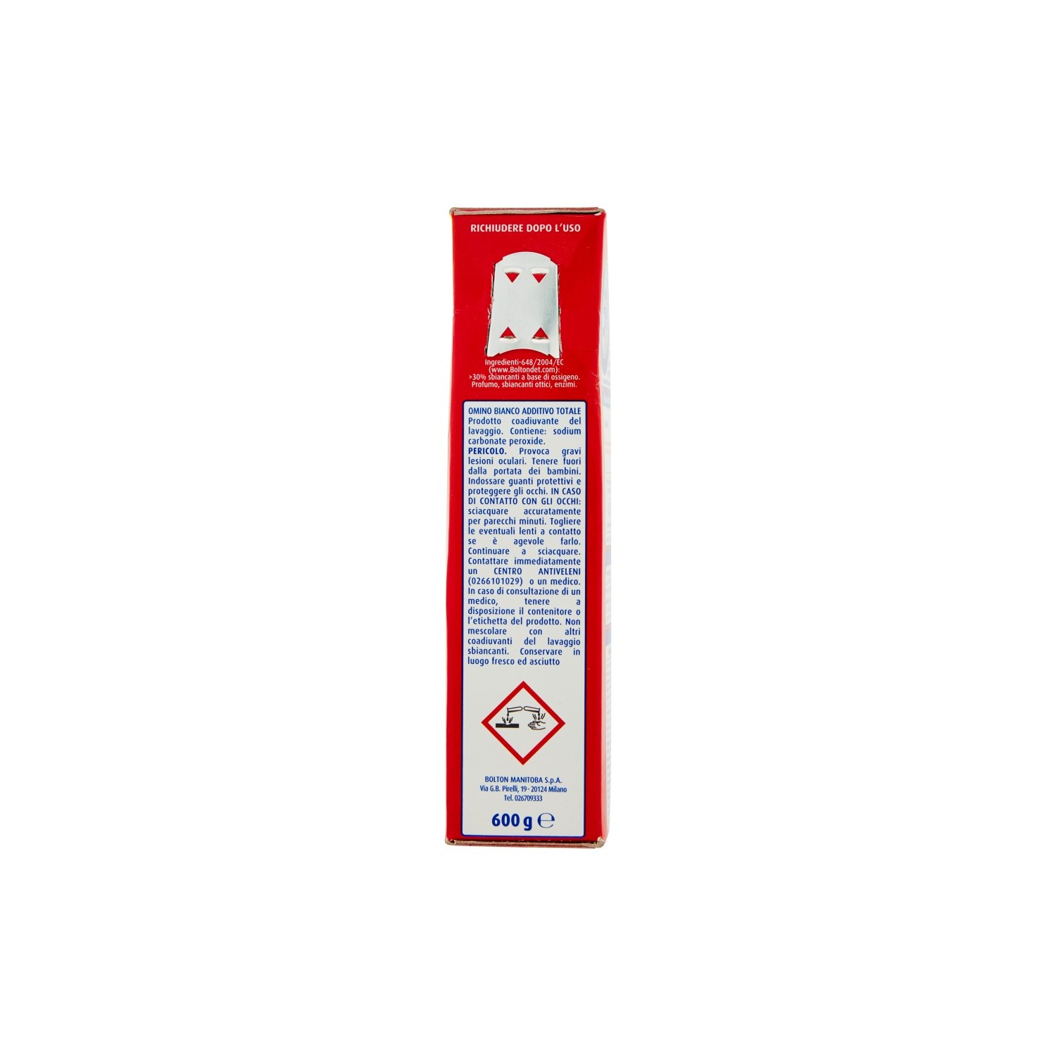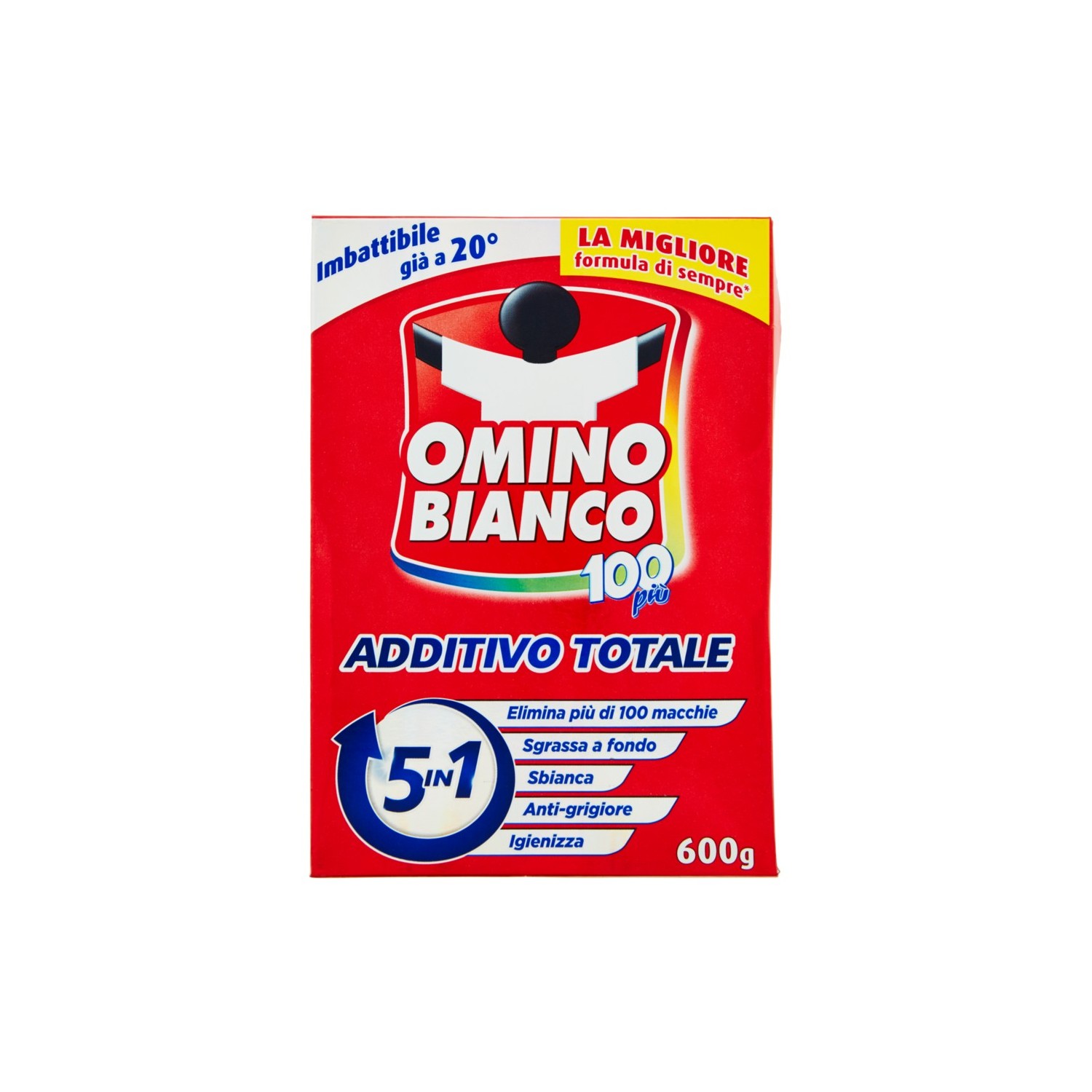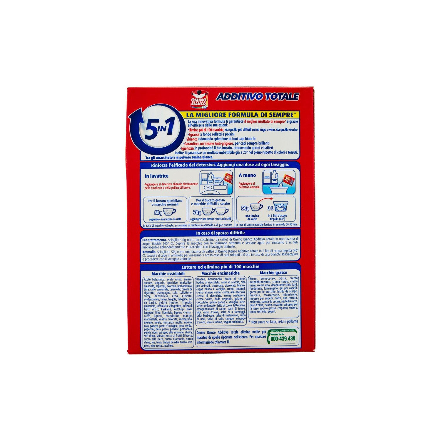 Omino Bianco Additivo Totale 5 in 1 è il primo additivo in polvere Omino Bianco che si prende cura dei tuoi capi a 360°.