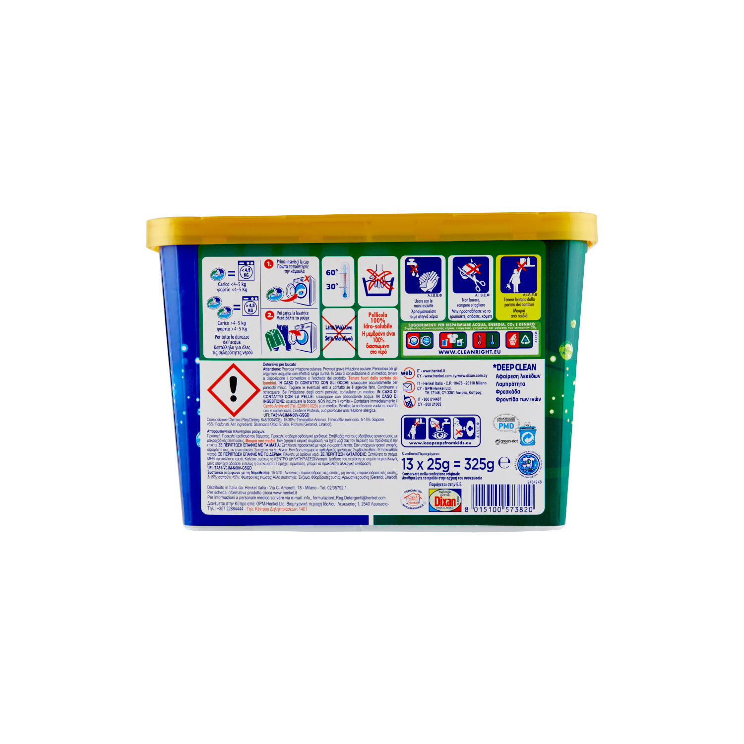Detersivo per bucato Attenzione: Provoca irritazione cutanea. Provoca grave irritazione oculare. Pericoloso per gli organismi acquatici con effetti di lunga durata. In caso di consultazione di un medico, tenere a disposizione il contenitore o l'etichetta del prodotto. Tenere fuori dalla portata dei bambini. IN CASO DI CONTATTO CON GLI OCCHI: sciacquare accuratamente per parecchi minuti. Togliere le eventuali lenti a contatto se è agevole farlo. Continuare a sciacquare. Se l'irritazione degli occhi persiste, consultare un medico. IN CASO DI CONTATTO CON LA PELLE: sciacquare con abbondante acqua. IN CASO DI INGESTIONE: sciacquare la bocca, NON indurre il vomito - Contattare immediatamente il Centro Antiveleni (Tel. 02/66101029 ) o un medico. Smaltire la confezione in accordo con le norme locali. Contiene Proteasi, può provocare una reazione allergica. UFI: TA51-V0JM-N00V-GSGD Riponi sempre questo prodotto in alto e chiudilo bene Chiudere la confezione correttamente. Tenere lontano dalla portata dei bambini. Usare con le mani asciutte Non bucare, rompere o tagliare A.I.S.E. www.keepcapsfromkids.eu