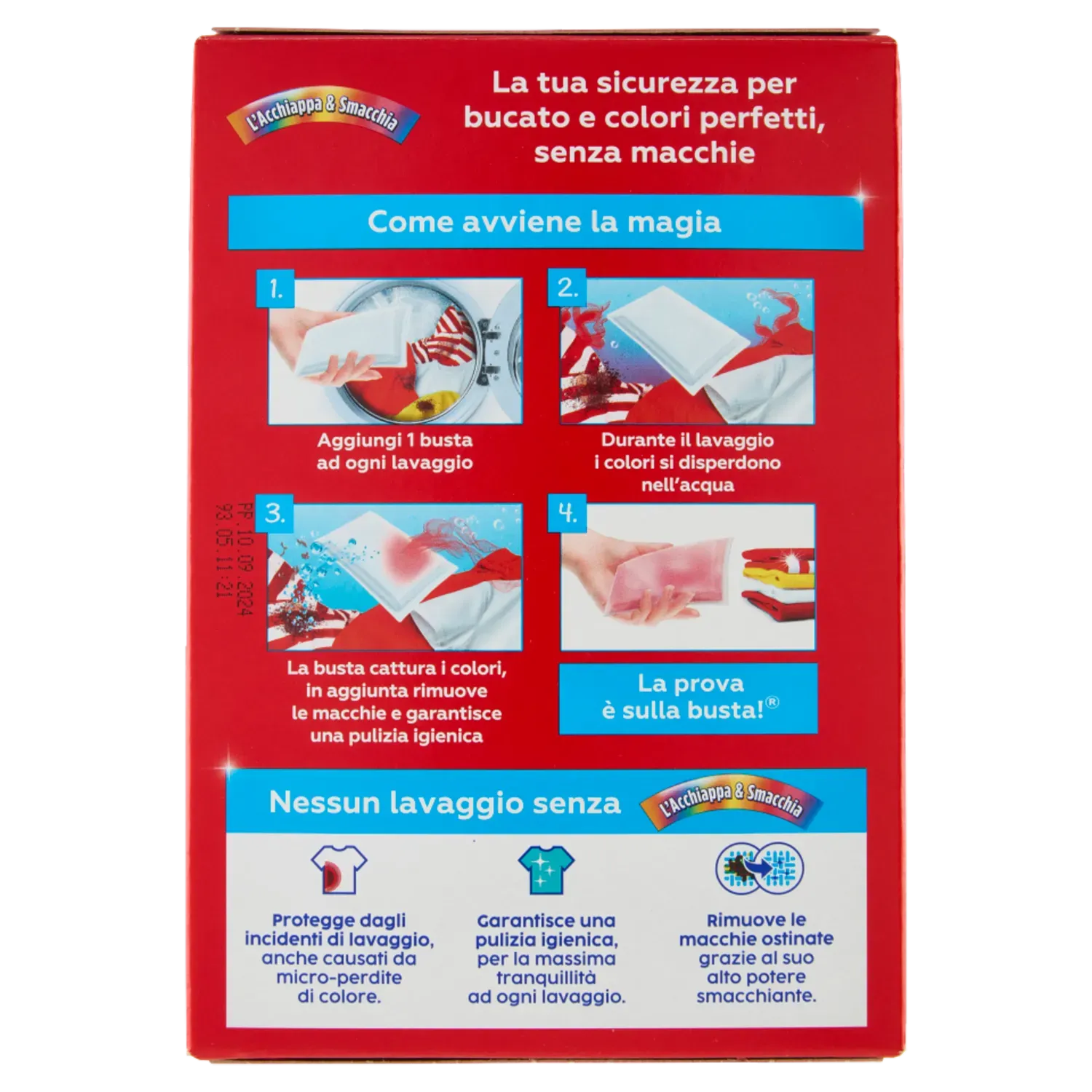 Queste buste multi-azione combinano due benefici in un unico prodotto: catturano i colori dispersi durante il lavaggio e rimuovono le macchie più ostinate,
