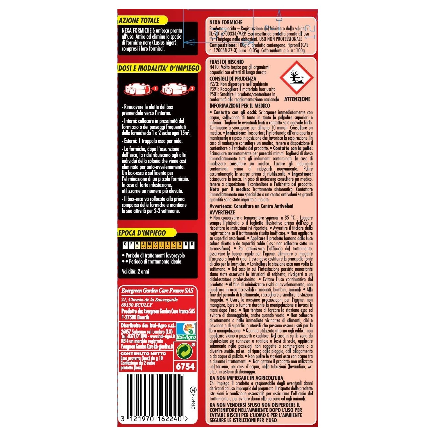 Rompendo gli ingressi alla trappola, le formiche vengono attratta dall’esca alimentare e la portano nel nido, dove nutrono le altre formiche e la regina eliminando l’intero formicaio. Blocca l’attività delle formiche in 3-6 giorni e mantiene le sue capacità di attrazione e attività per un lungo periodo (fino a 4 settimane).