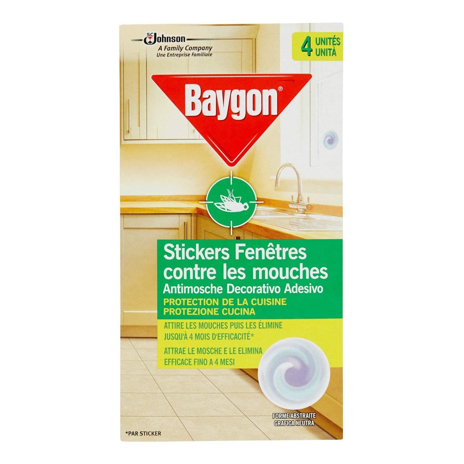 Antimosche Decorativo Adesivo Protezione Cucina si applica direttamente sul vetro. Grazie ai suoi colori e alla sua forma, attira le mosche domestiche (Musca Domestica). Una volta posate sull'adesivo, le mosche consumano la sua sostanza attiva e muoiono in qualche ora, senza restare incollate.