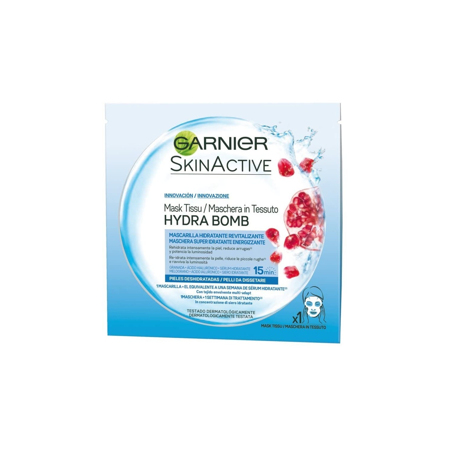 Garnier SkinActive è una maschera in tessuto infusa con acido ialuronico e estratto di melograno.