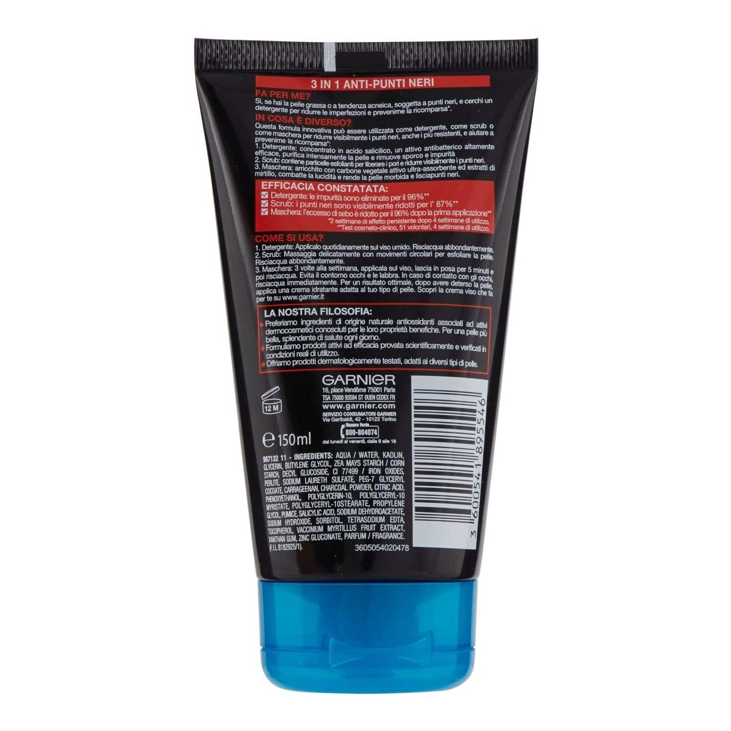 Detergente Punti neri al Carbone Vegetale Garnier Pure Active 3in1 Maschera - 150ml