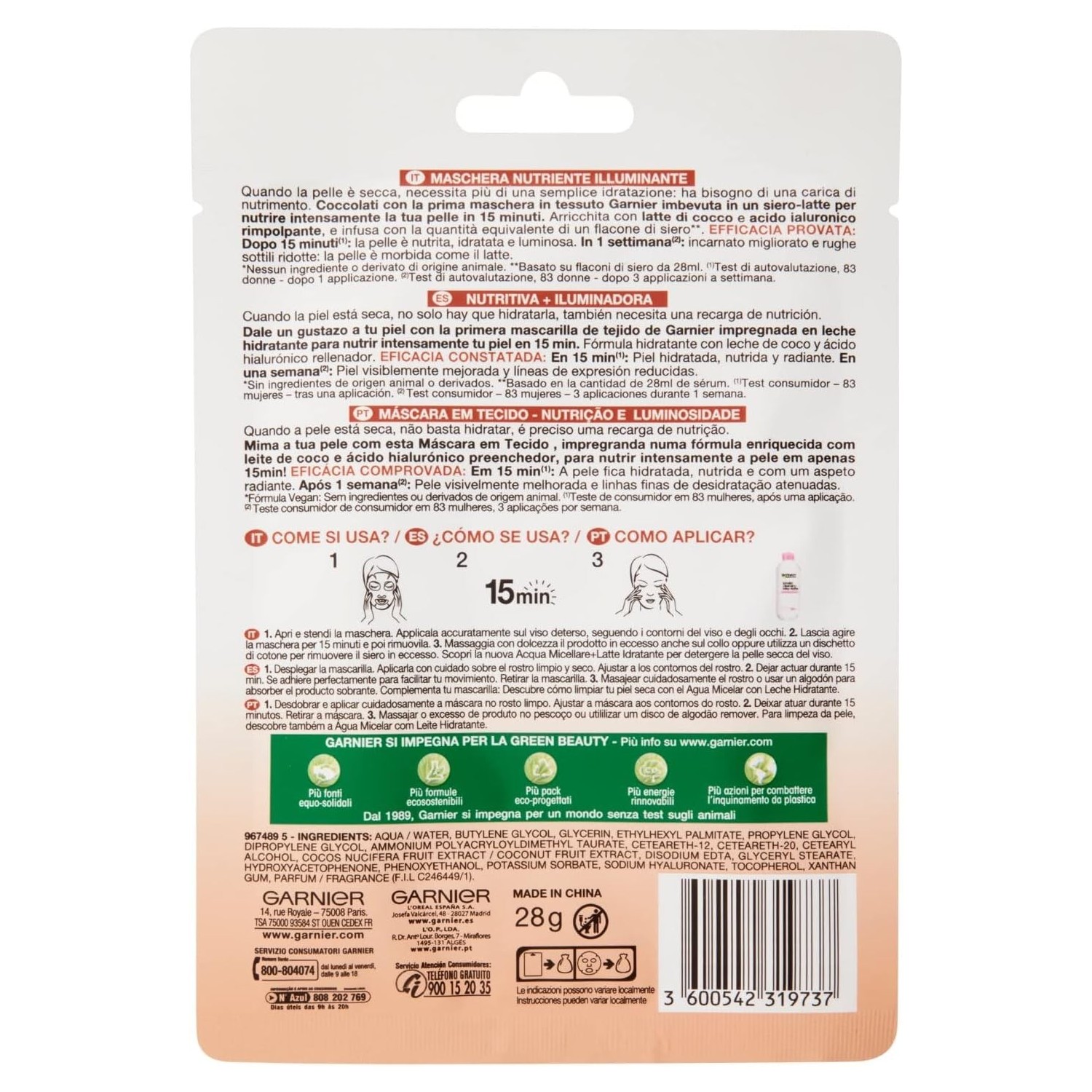 - Tipo: Maschera in Tessuto Nutriente + Illuminante.