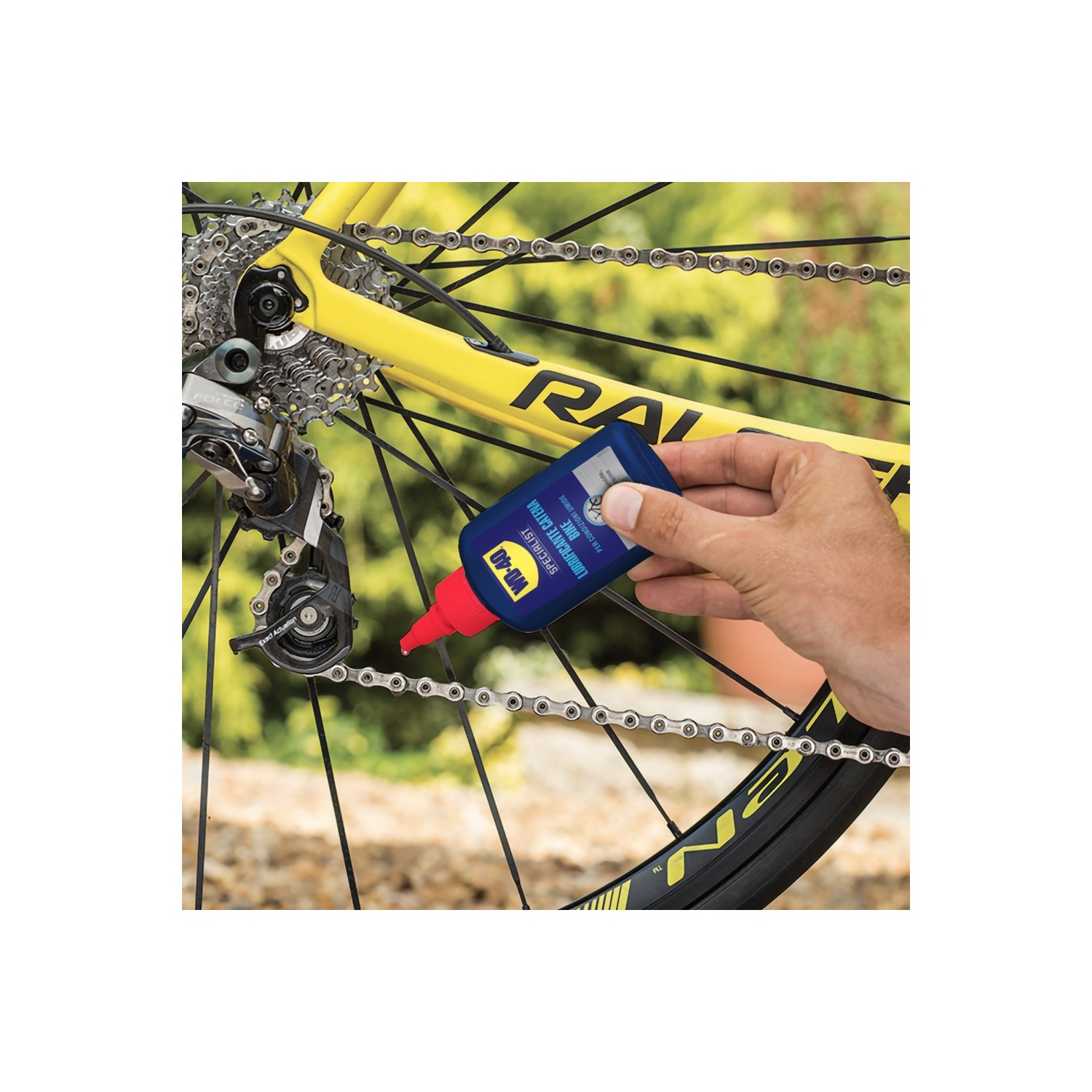 Wd40 Bike Lubrificante condizioni umide in uso mentre si lubrifica la catena vicino il cambio