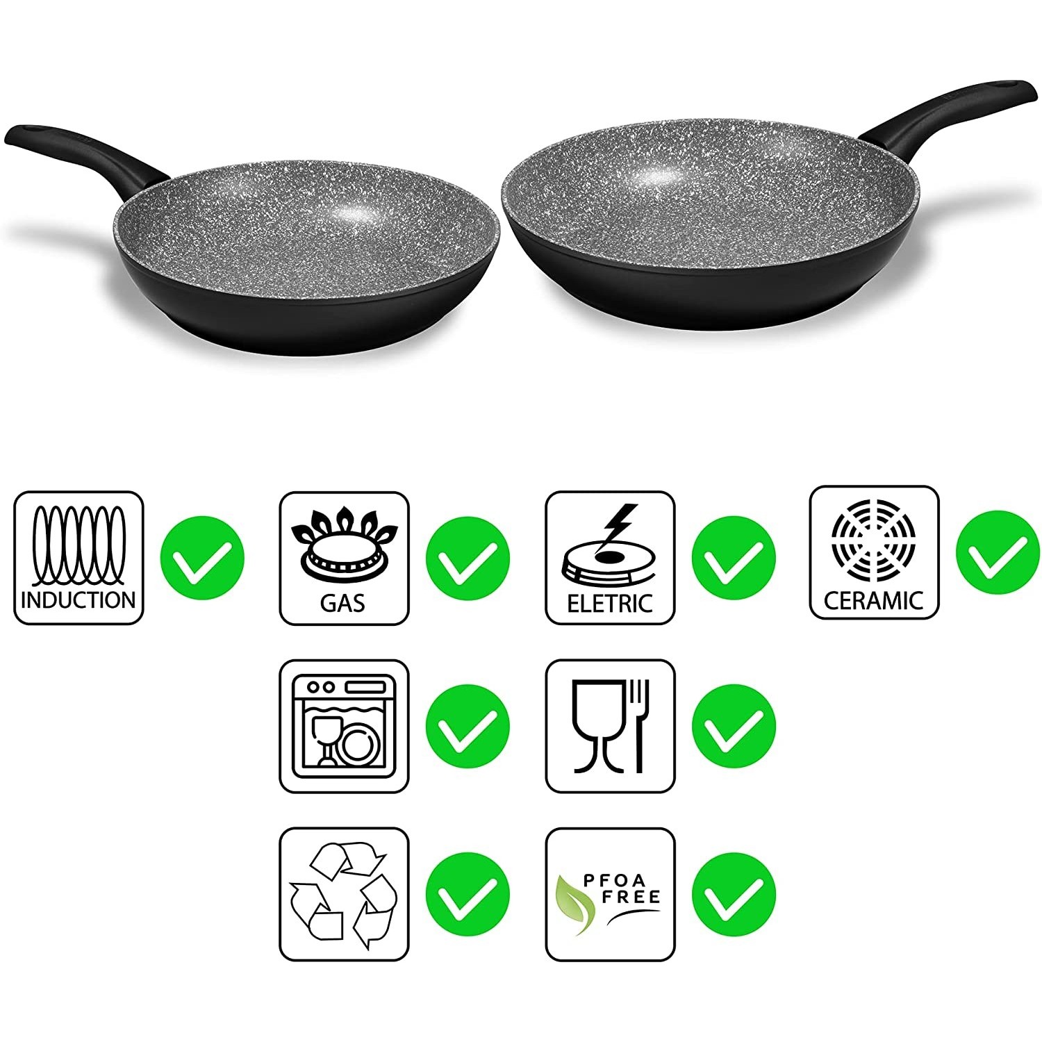 La linea Nera Stone in Black Aeternum ha creato un set di Padelle da 2 Pezzi adatti all'induzione che soddisfano le esigenze di chi predilige prestazioni eccellenti e affidabilità nella preparazione di qualsiasi piatto ricercato e sano.