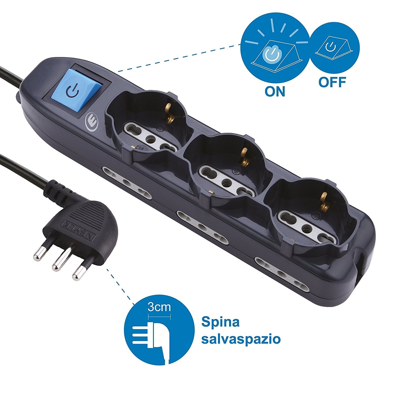 - 3 prese Schuko + 6 prese bivalenti per compatibilità universale sui 230 V.