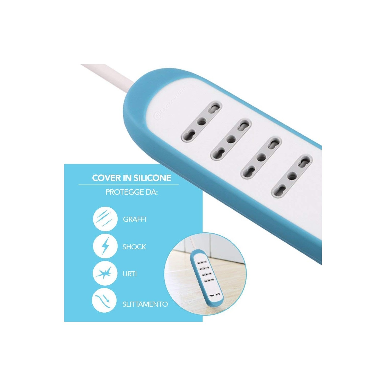 La caratteristica più distintiva è il rivestimento in silicone colorato (blu), che rende la multipresa anti‑urto, antigraffio e antiscivolo.