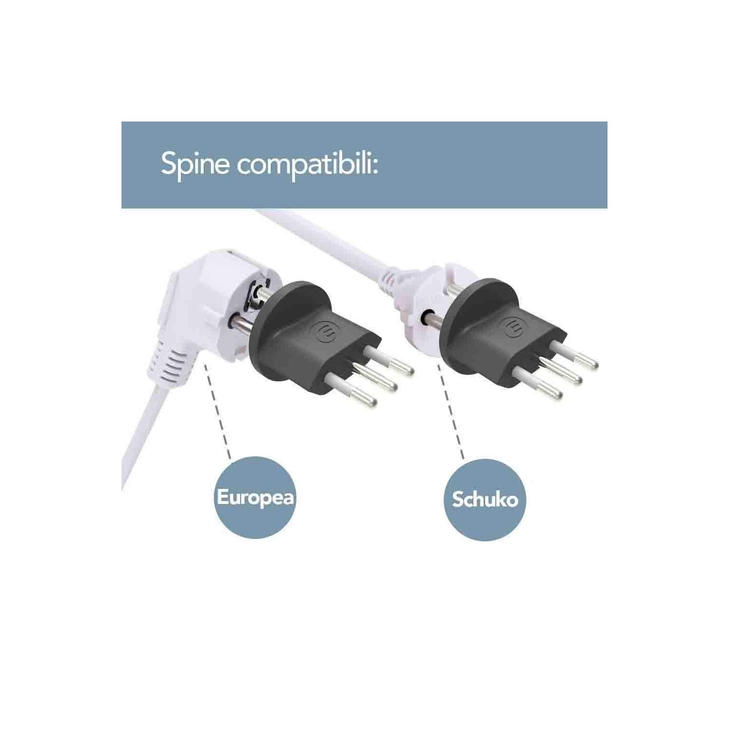 - Ampia compatibilità con spine Schuko o europee standard.
