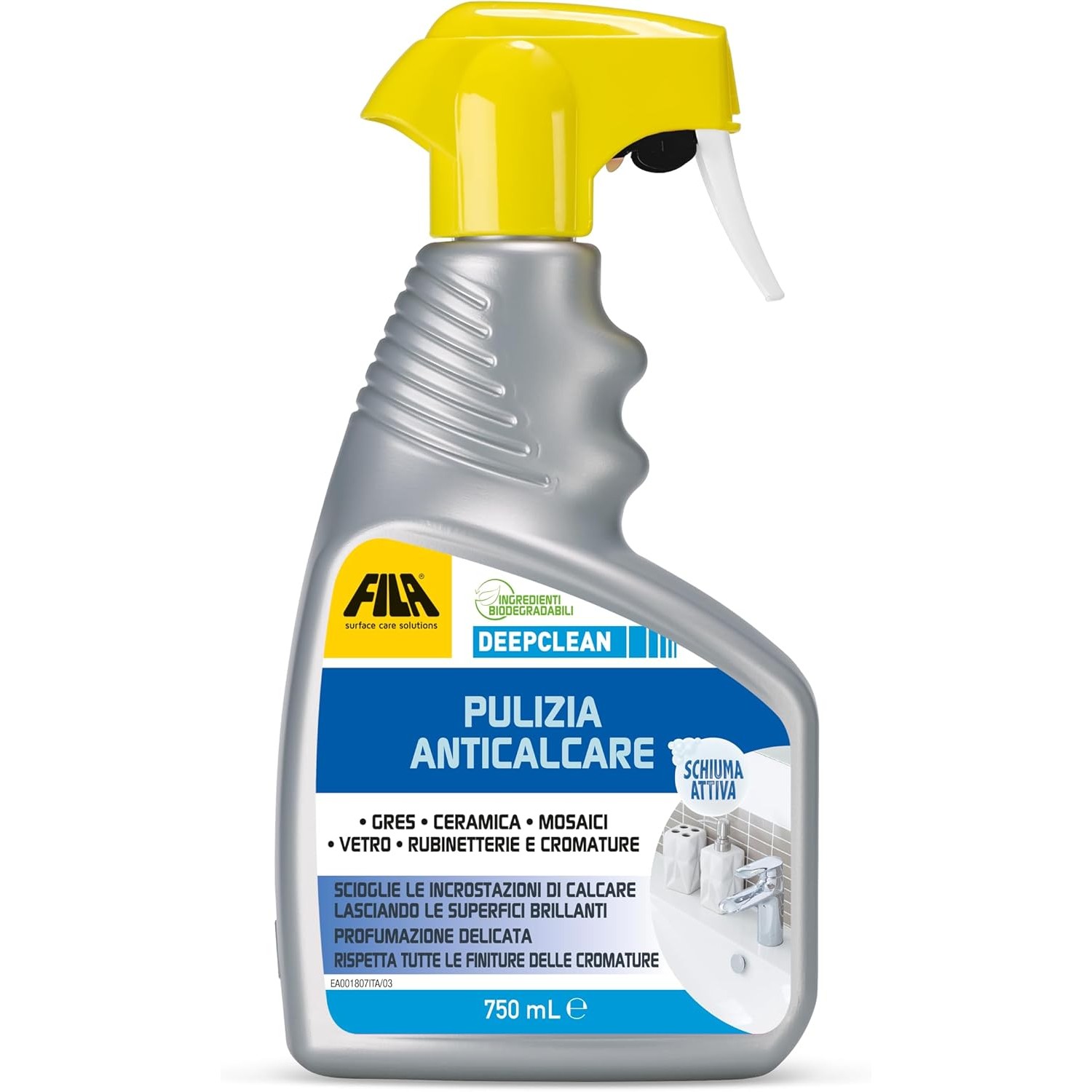• Applicazione: Spruzzare Fila Deepclean sulla superficie da pulire, lasciarlo agire per qualche secondo e risciacquare accuratamente con una spugna umida.