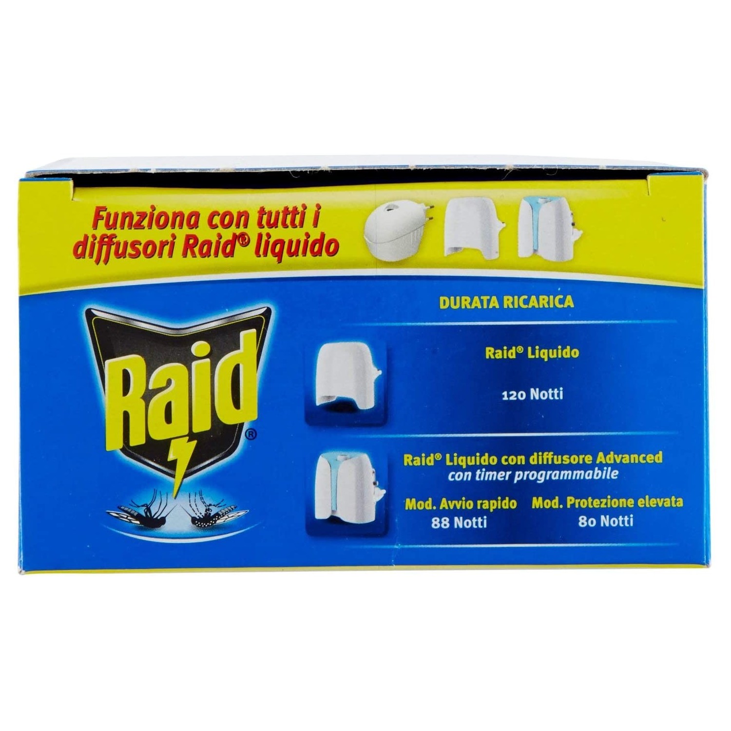 Raid Liquido offre 120 notti (8 ore per notte) di azione costante per tutta la notte contro le zanzare tigre (Aedes albopictus) e zanzare comuni (Culex pipiens), anche a finestre aperte e luci accese. Raid Liquido offre una protezione continua, discreta e inodore. Raid Liquido protegge una stanza di 20m3