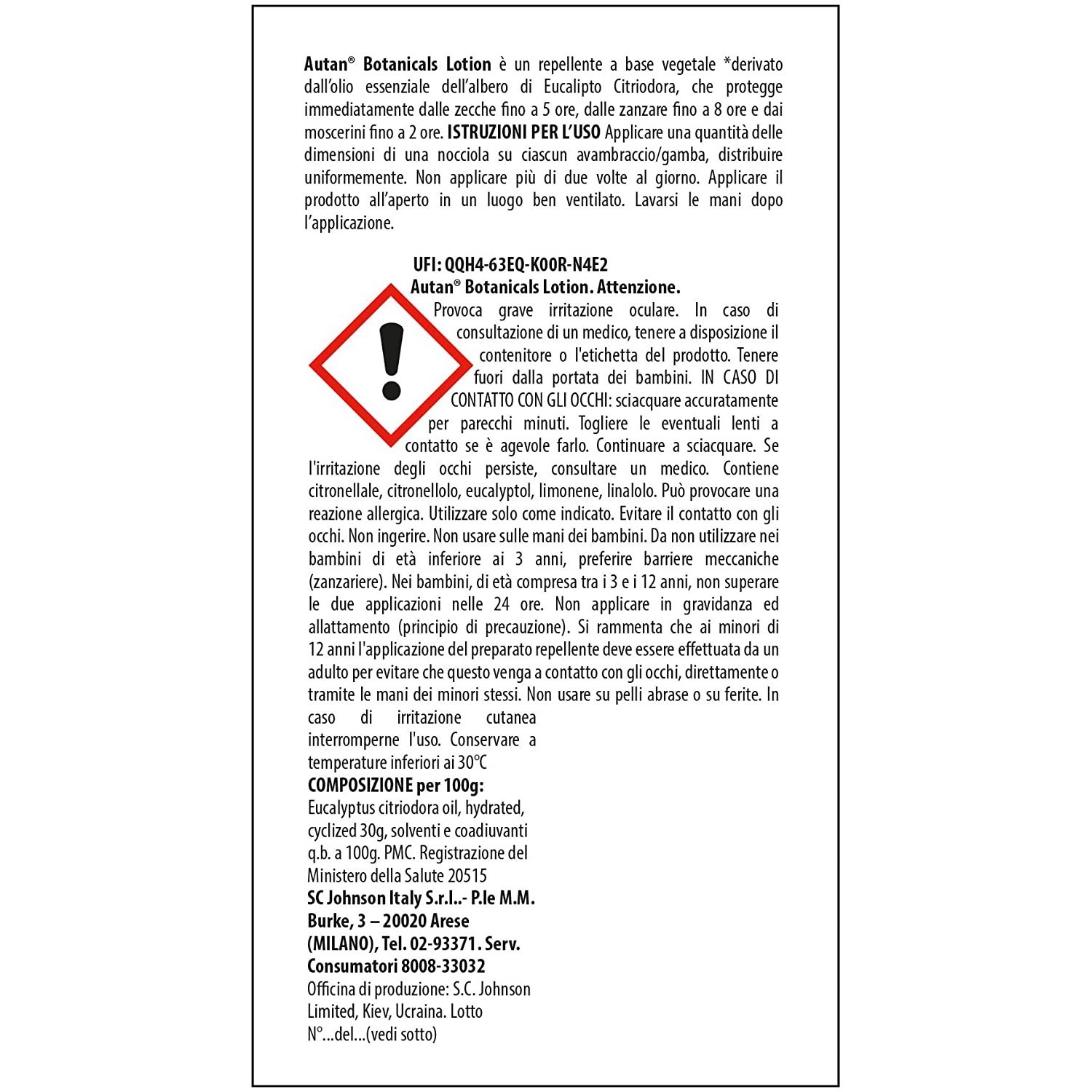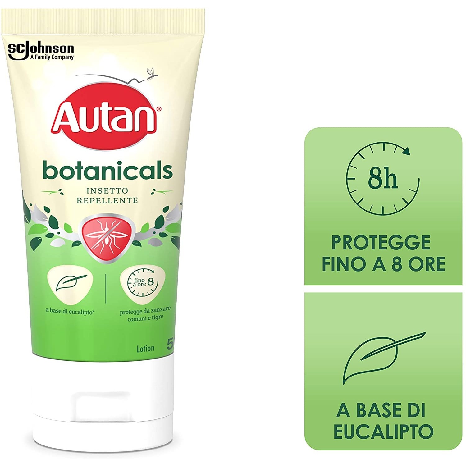 Autan Botanicals Lotion è una lozione per zanzare a base di Eucalipto. Ha un principio attivo derivato dall'olio distillato dell'albero di Eucalyptus citriodora ed è senza DEET.