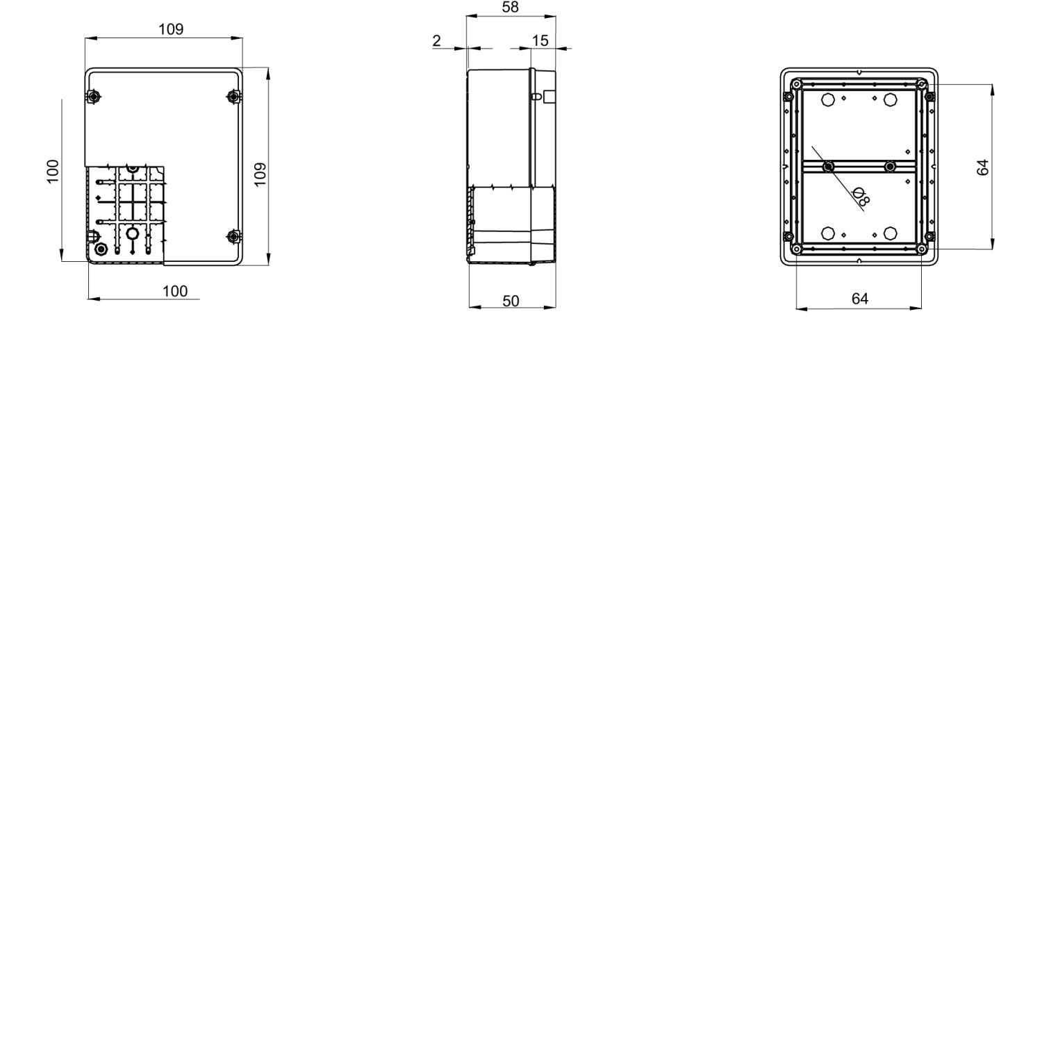 - Dimensioni esterne: 109 × 109 × 58 mm;