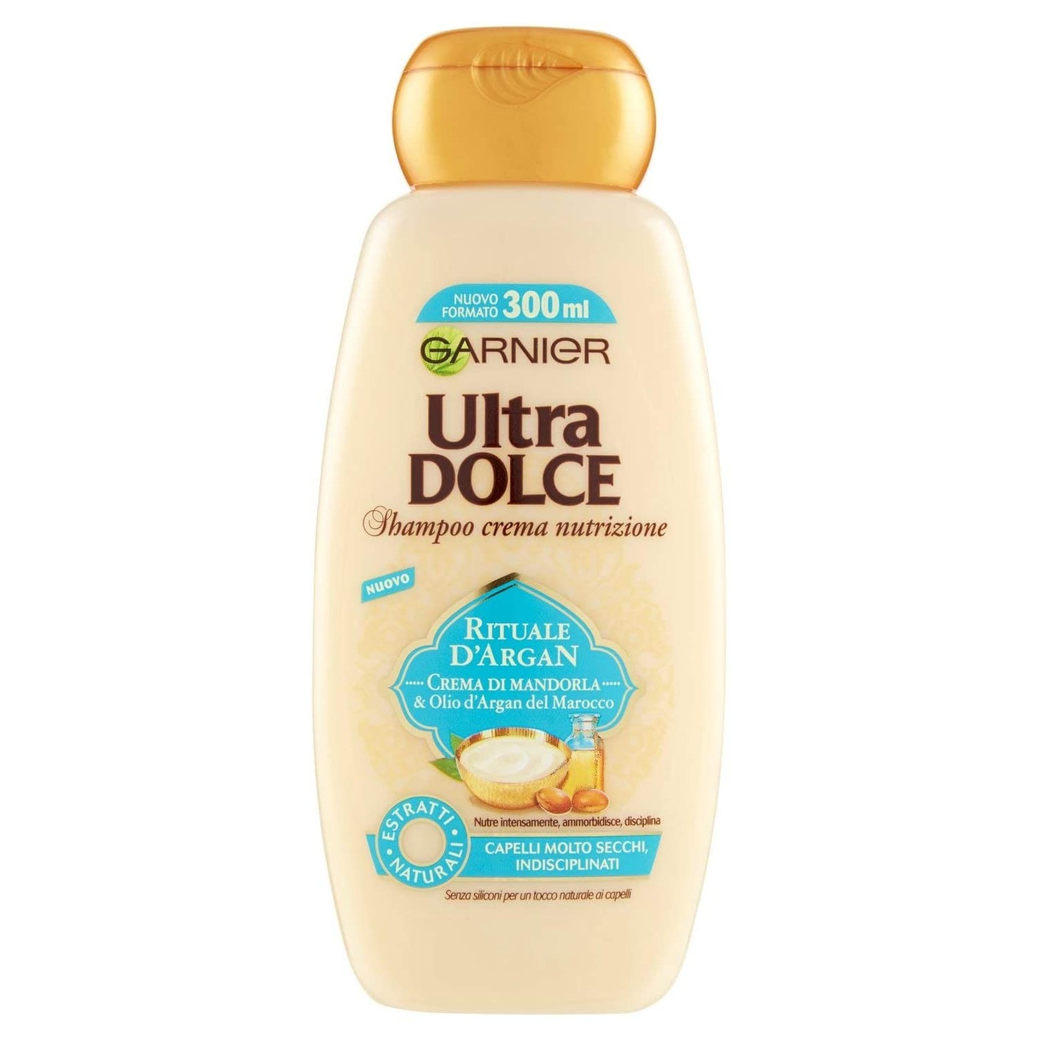 Ultra Dolce crea la sua nuova ricetta di nutrizione intensa specialmente pensata per i capelli molto secchi ed indisciplinati, associando: - L'Olio d'Argan, un olio prezioso utilizzato nei rituali di bellezza per il suo potere altamente nutriente e protettivo. - La Crema di Mandorla, selezionata per la sua ricchezza e la sua cremosità, è ideale per ammorbidire ed addolcire i capelli. Risultato: Nutriti intensamente fino alle punte, i capelli ritrovano morbidezza e dolcezza infinita. Più facili da pettinare, risplendono di bellezza! Olio d'Argan da filiera equo-solidale Il nostro Olio d'Argan, naturale e proveniente da fonti rinnovabili, è ottenuto da commercio equo-solidale che contribuisce allo sviluppo economico di una cooperativa del Sud-Ovest del Marocco composta da centinaia di donne. L'Olio è estratto in modo eco-sostenibile dal nocciolo dei frutti dell'Argania, un processo interamente svolto dalle donne della cooperativa dalla raccolta fino alla spremitura a mano.