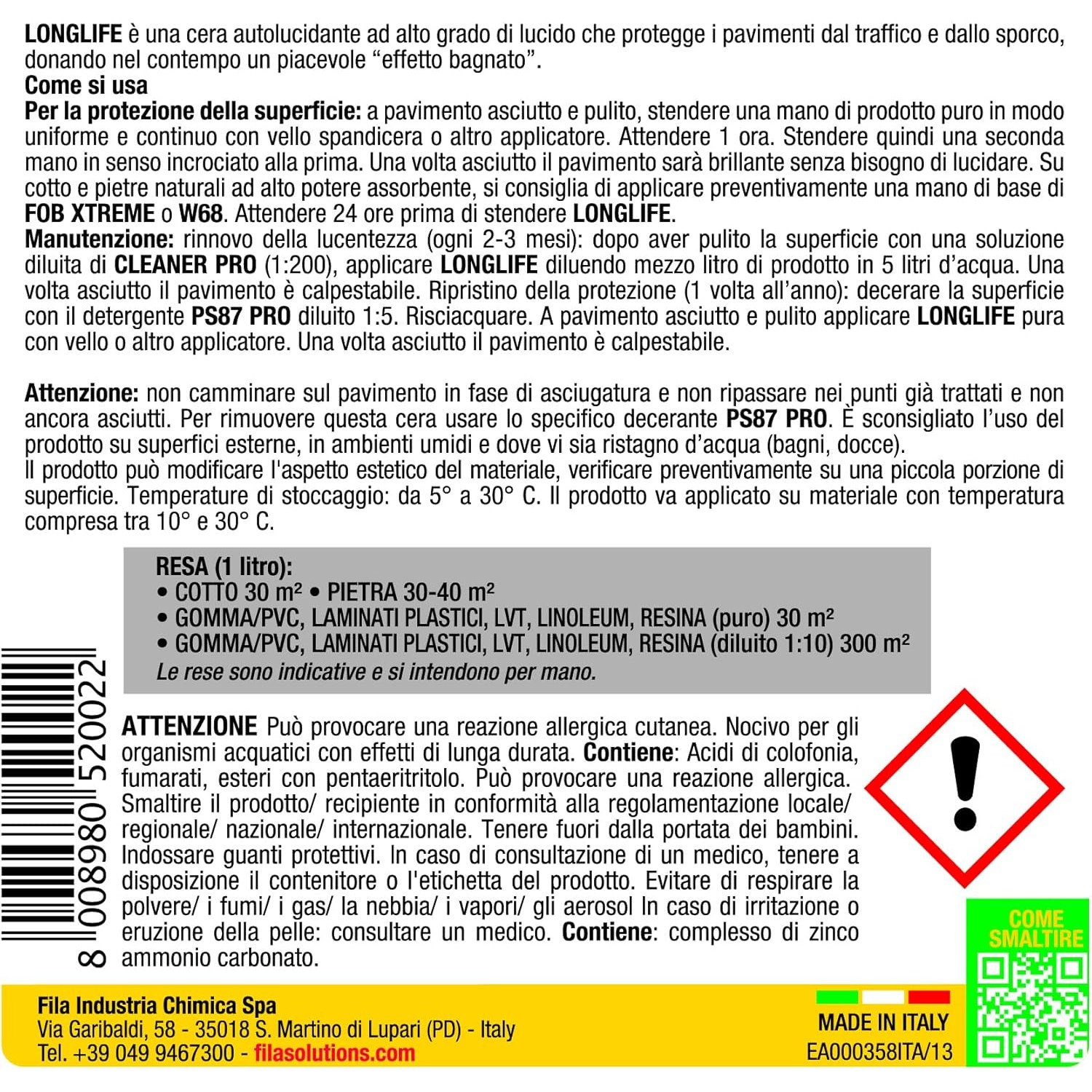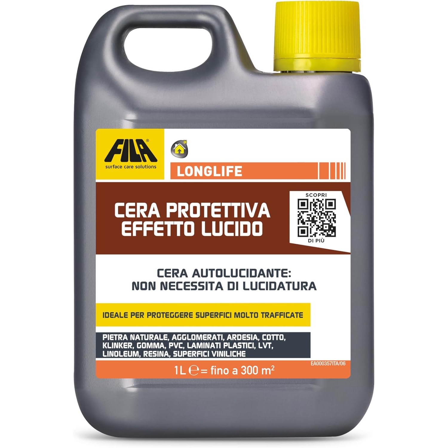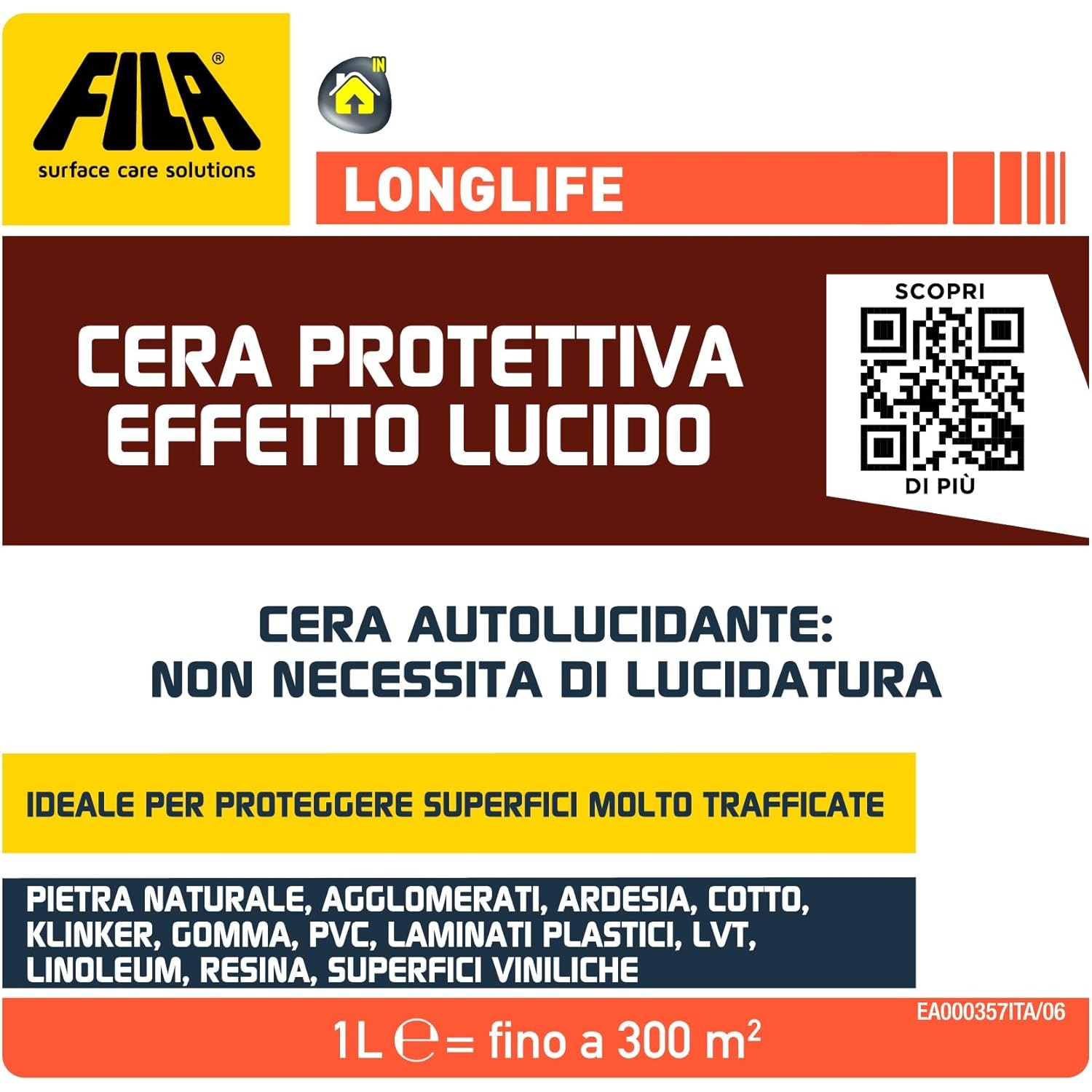 Fila Longlife è una cera protettiva effetto lucido ideale per proteggere e valorizzare pavimenti soggetti ad alto traffico.