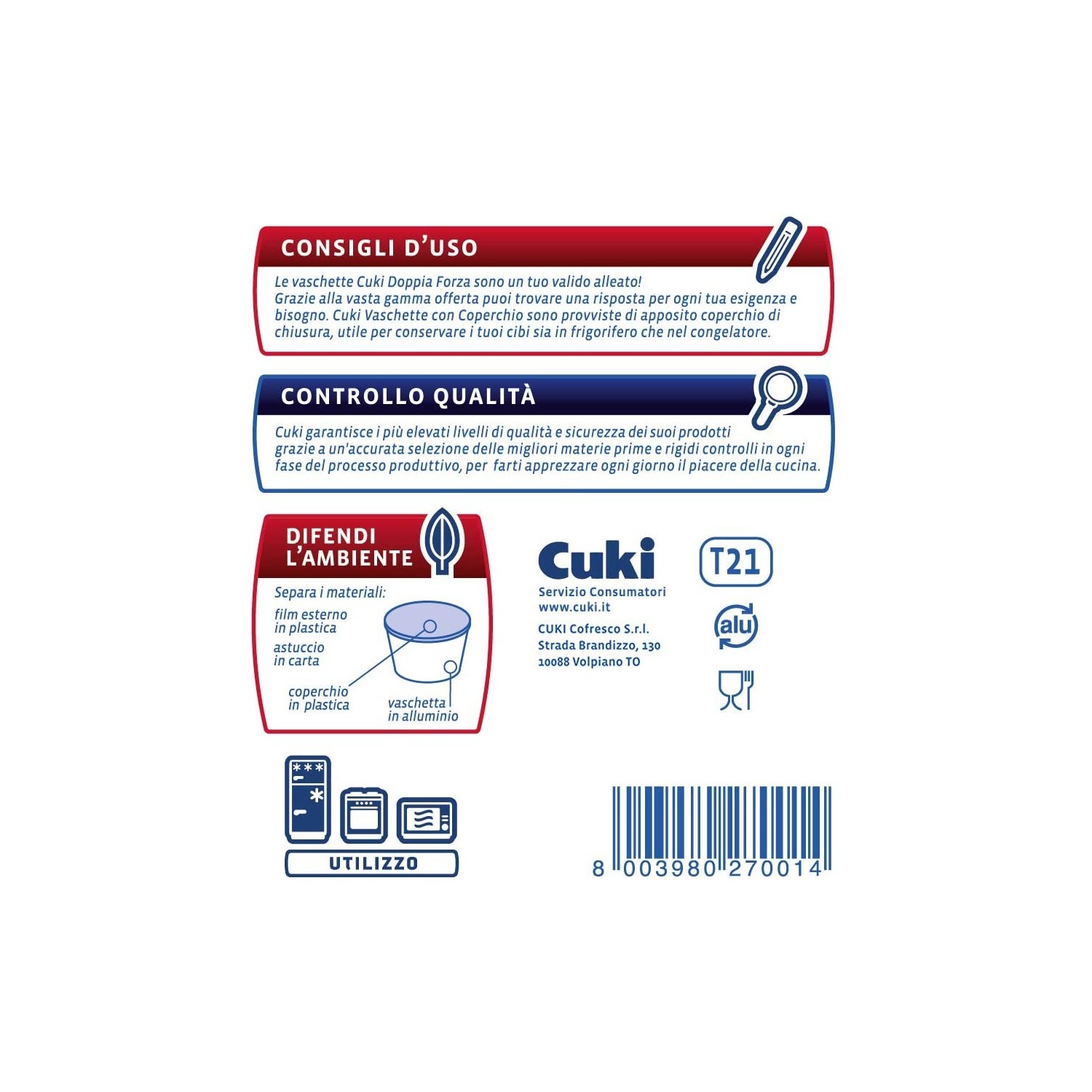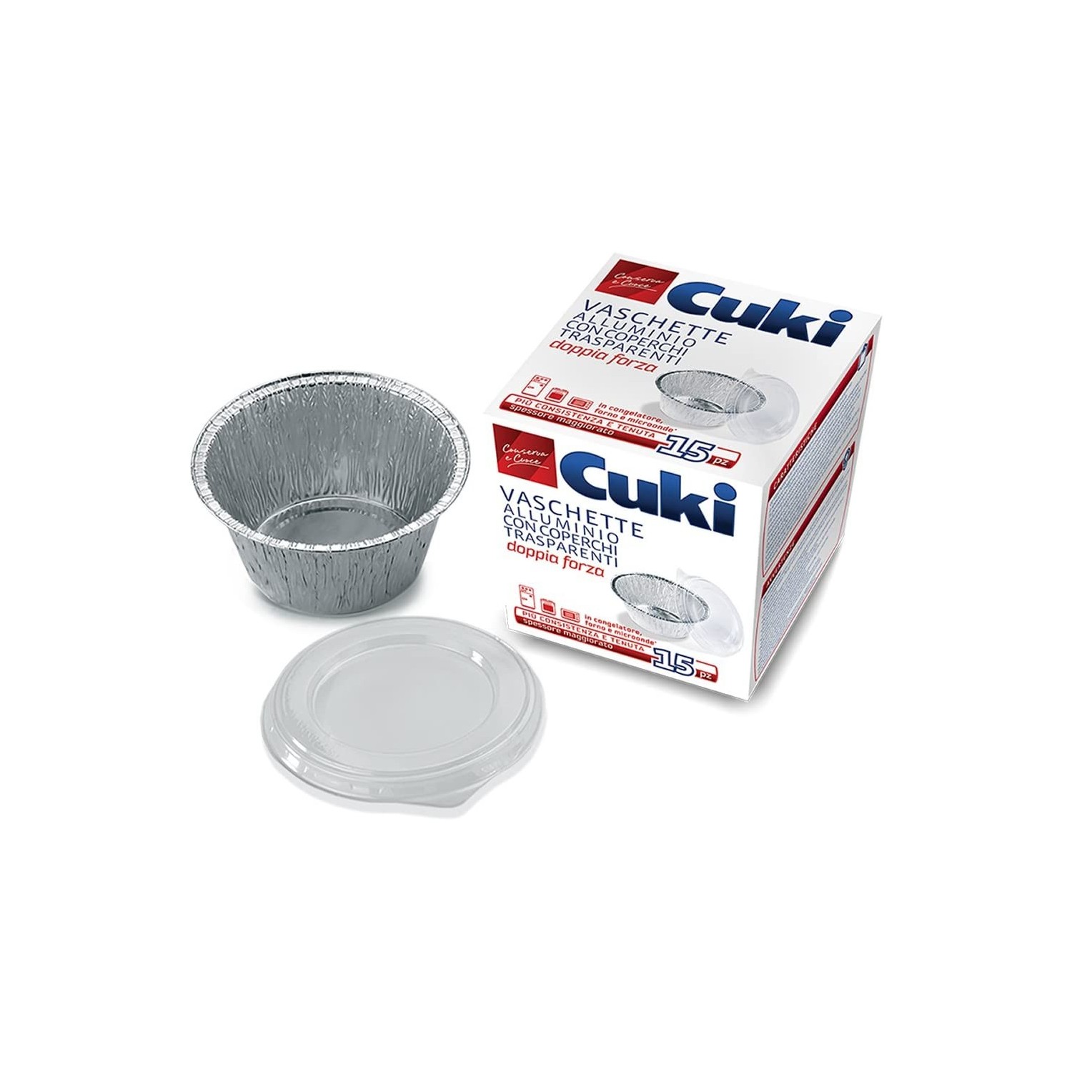 Le Vaschette Cuki Alluminio Doppia Forza sono realizzate in alluminio a spessore maggiorato per offrirti un'elevata consistenza e tenuta. Ti permettono inoltre di ottenere una cottura ottimale, più veloce e omogenea, poiché l'alluminio è un ottimo conduttore di calore. Cuki Vaschette con Coperchio sono provviste di apposito coperchio di chiusura e sono indicate per la cottura al forno, per la conservazione dei tuoi cibi nel frigorifero o nel congelatore, per lo scongelamento e il successivo riscaldamento, per l'asporto. Durante la congelazione Cuki Vaschette con Coperchio proteggono i cibi dal disseccamento per disidratazione, dall'irrancidimento dei grassi per l'azione dell'aria e evitano la trasmissione degli odori tra un cibo e l'altro. I pratici coperchi, facili da utilizzare, permettono la sovrapposizione, così da sfruttare con ordine lo spazio nel congelatore. Consigli d'uso Le Vaschette Cuki Doppia Forza sono un tuo valido alleato! Grazie alla vasta gamma offerta puoi trovare una risposta per ogni tua esigenza e bisogno. Cuki Vaschette con Coperchio sono provviste di apposito coperchio di chiusura, utile per conservare i tuoi cibi sia in frigorifero che nel congelatore.